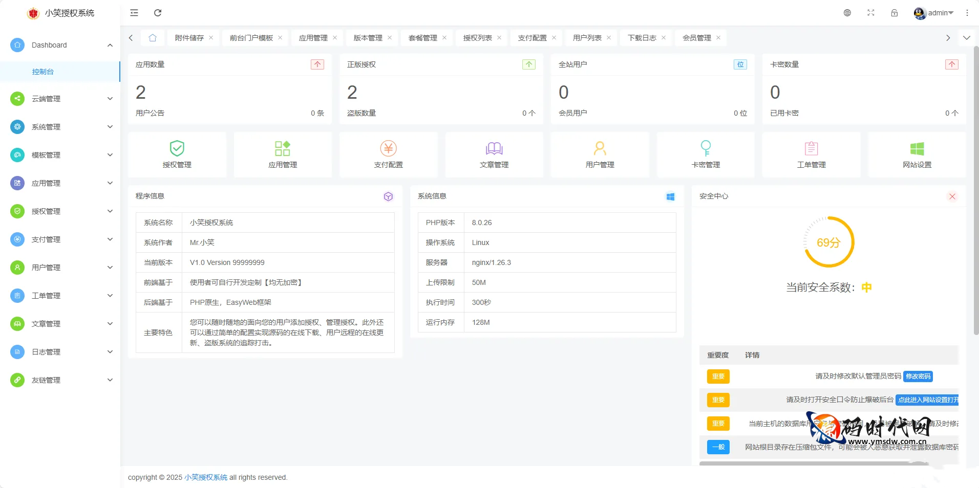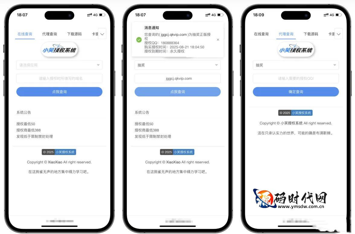 对于个人开发者或小型开发团队而言,如何高效管理多款源码的授权、防止盗版、并为用户提供便捷的购买和更新体验,往往是一项繁琐且耗时的工作。小笑授权系统正是为解决这一痛点而诞生的一套专业级多应用授权管理平台。它基于 PHP 7.3 + MySQL 5.6+ 开发,可部署于 Nginx 环境,以极简的代码引用方式,帮助开发者快速为自己的应用软件或源码加上授权保护,并提供一套完整的用户自助服务体系。