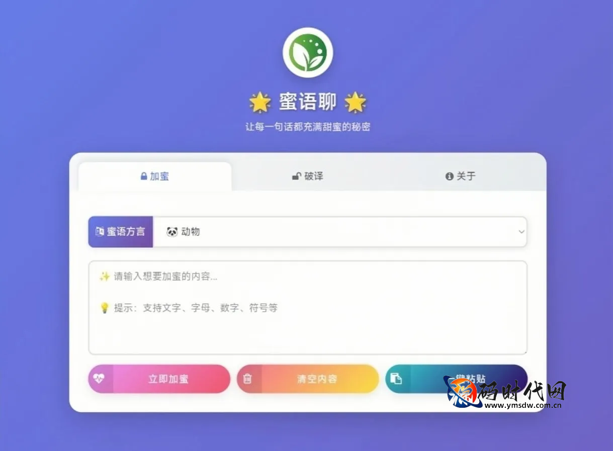• 多种加密类型可选:内置多种”语言”风格,如猫语、狼语、熊语等,每种风格对应不同的字符替换规则和语感 。你可以根据喜好自由切换,让加密后的文字既神秘又带点萌感。后台支持新增自定义风格,满足更多创意需求。